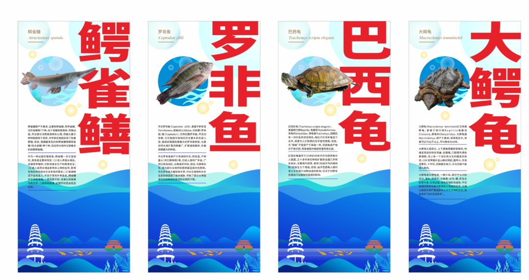翠屏區(qū)人工增殖放流活動(dòng)現(xiàn)場(chǎng)展示的鱷雀鱔等水生外來(lái)入侵物種科普?qǐng)D片。