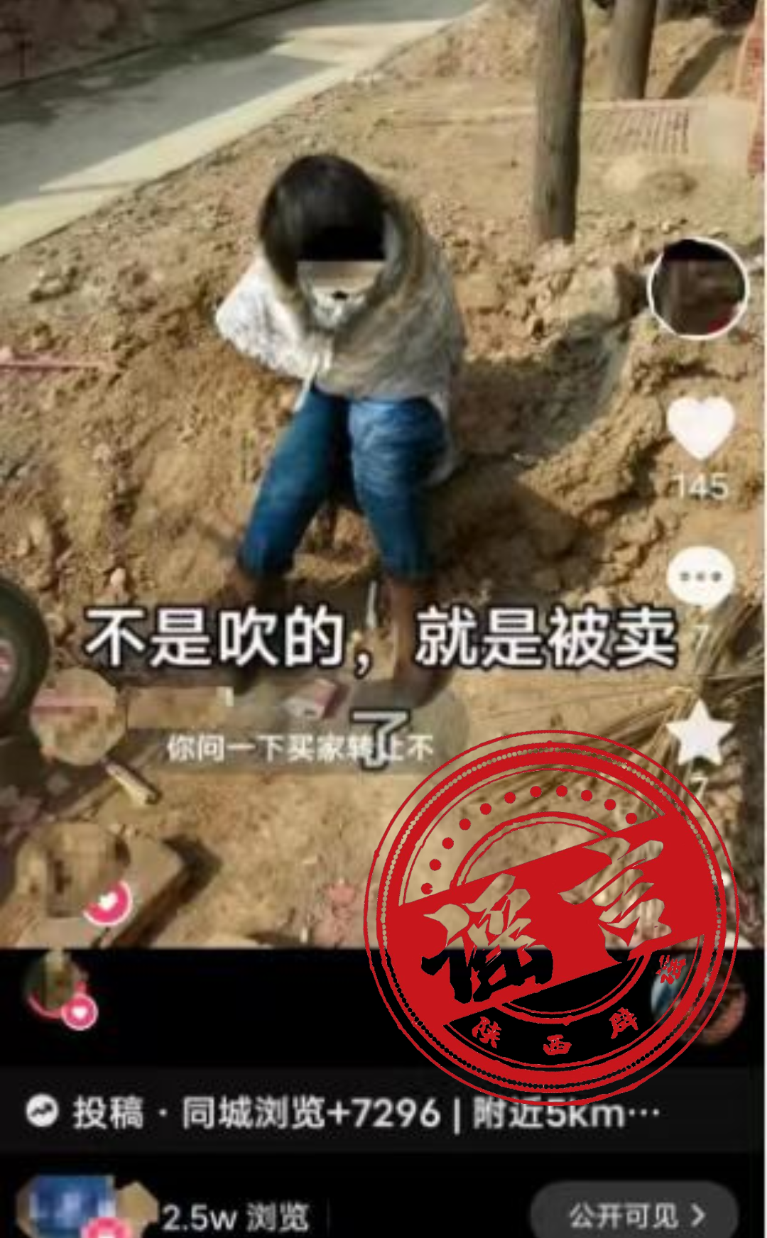 2024年1月10日,網(wǎng)民張某某(女,39歲,蒲城龍陽(yáng)人)為博取關(guān)注、吸引流量,利用了一張自己14年前拍攝坐在土堆前的照片,并配有“不是吹的,就是被賣了”的字眼制作成視頻后,發(fā)布在抖音平臺(tái)上,同時(shí)與網(wǎng)民互動(dòng)交流,先后有超過2.5萬人次瀏覽。