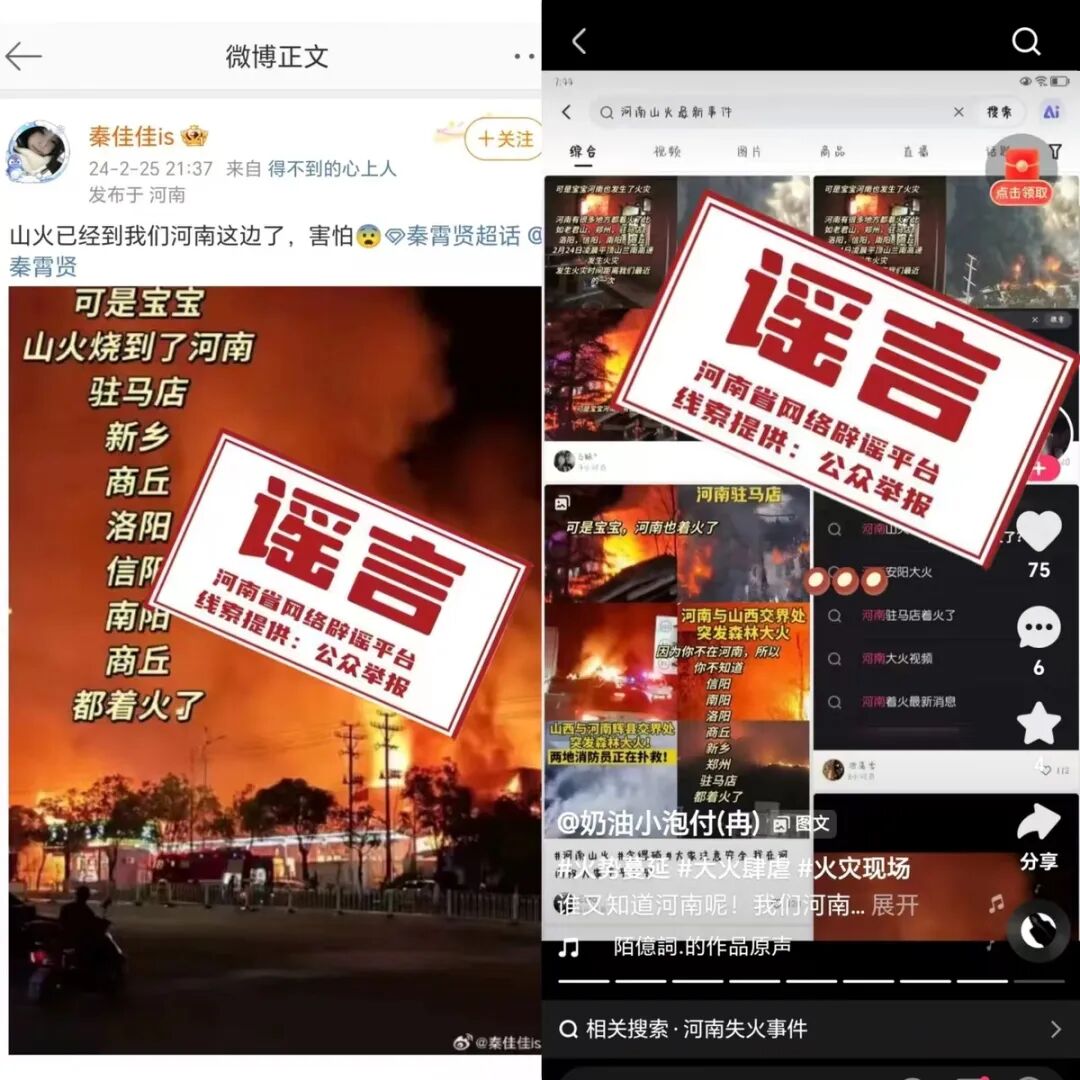 近日,微博用戶(hù)@秦佳佳is、視頻平臺(tái)用戶(hù)奶油小泡付(冉)等賬號(hào)發(fā)布“山火燒到了河南”信息,并配上多張火災(zāi)圖片。經(jīng)河南省網(wǎng)絡(luò)辟謠平臺(tái)向省林業(yè)局等相關(guān)部門(mén)核查,截至2月26日,河南省域內(nèi)未發(fā)生山火,網(wǎng)傳信息為謠言。請(qǐng)廣大網(wǎng)民不信謠、不傳謠。