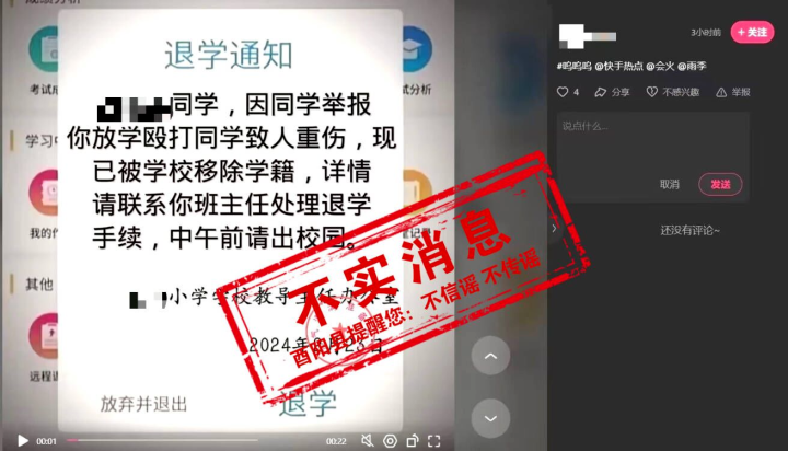 無獨有偶,近期重慶酉陽縣某小學(xué)一學(xué)生也對這則謠言進行“模仿秀”,在網(wǎng)上惡搞“克隆”出“退學(xué)通知”,并以學(xué)校名義署名落款。相關(guān)謠言在網(wǎng)上傳播后引發(fā)議論。目前,這則謠言已被刪除,學(xué)校對該學(xué)生進行了批評教育。