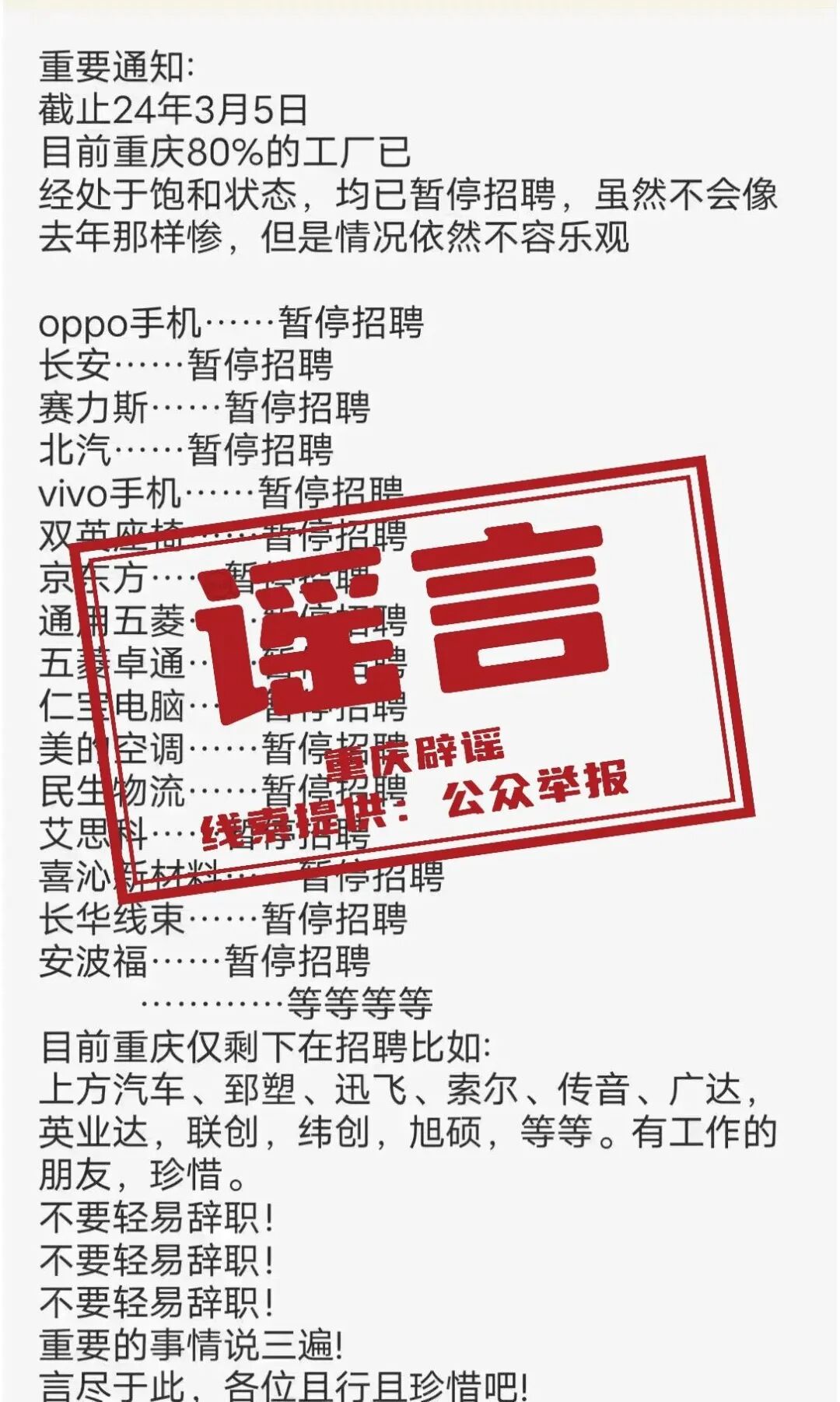 近日,有網(wǎng)民在某網(wǎng)絡(luò)平臺(tái)上發(fā)布信息:“目前重慶市80%的廠已處于飽和狀態(tài),均已暫停招聘”,引發(fā)社會(huì)關(guān)注。經(jīng)相關(guān)部門核實(shí),網(wǎng)傳信息為謠言。