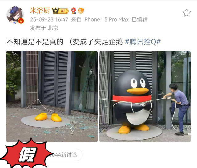 比如騰訊公司門口的企鵝雕塑,公司為了防御臺(tái)風(fēng),將企鵝用繩拴了起來。而有網(wǎng)民傳播的圖片顯示企鵝只剩雙腳,上身被風(fēng)吹走。騰訊QQ回應(yīng):“鵝拴著呢,穩(wěn)穩(wěn)的。”